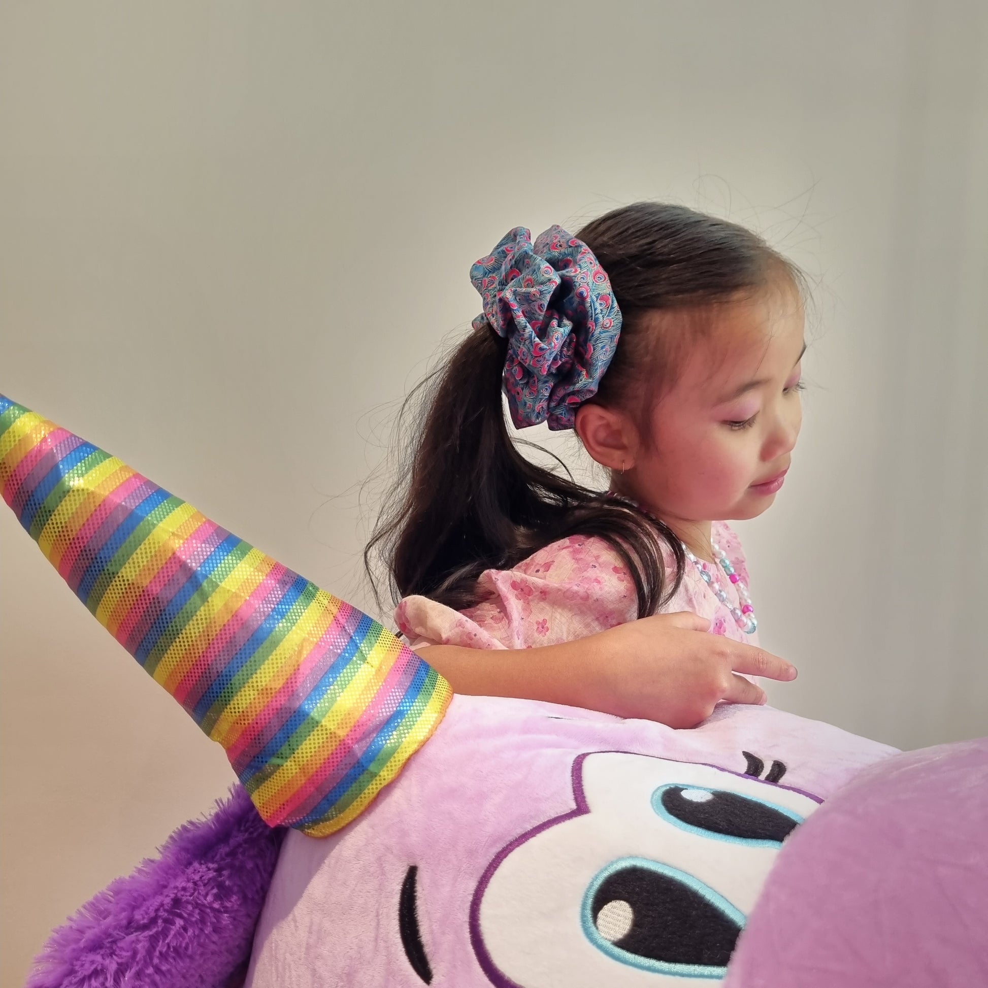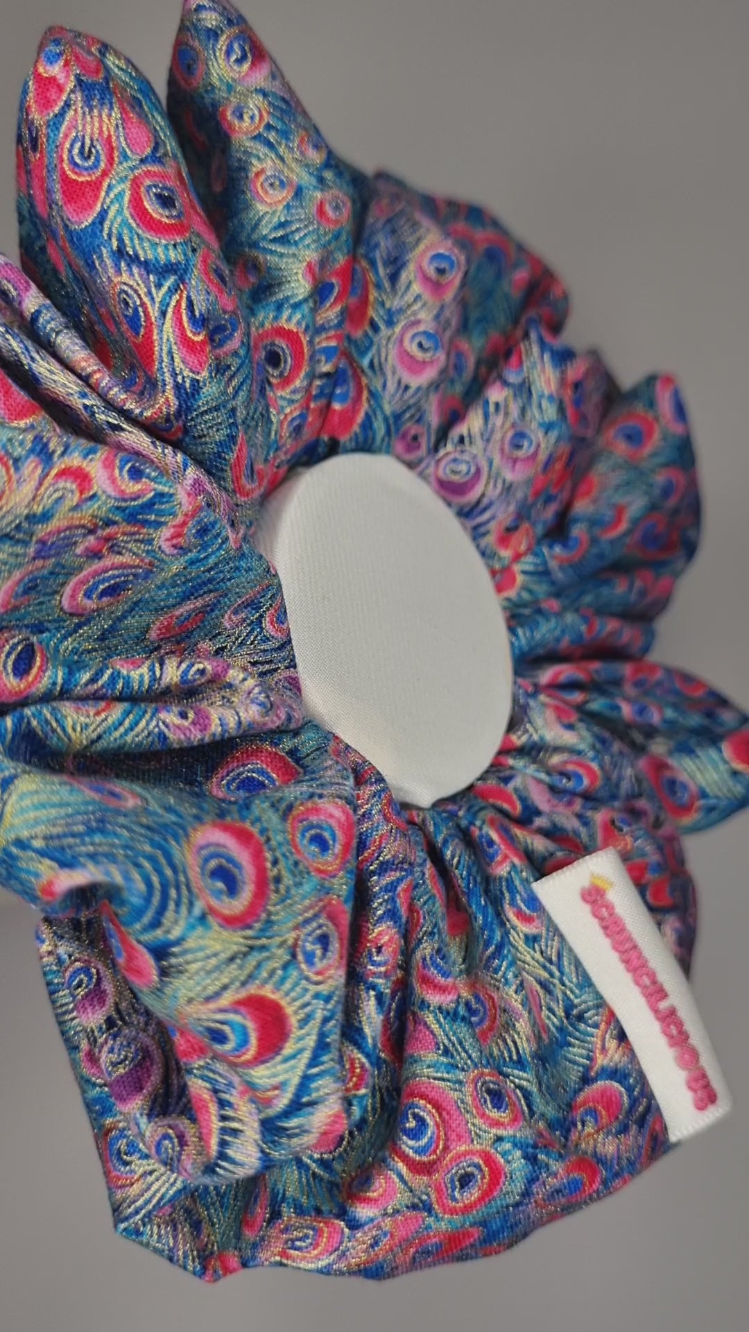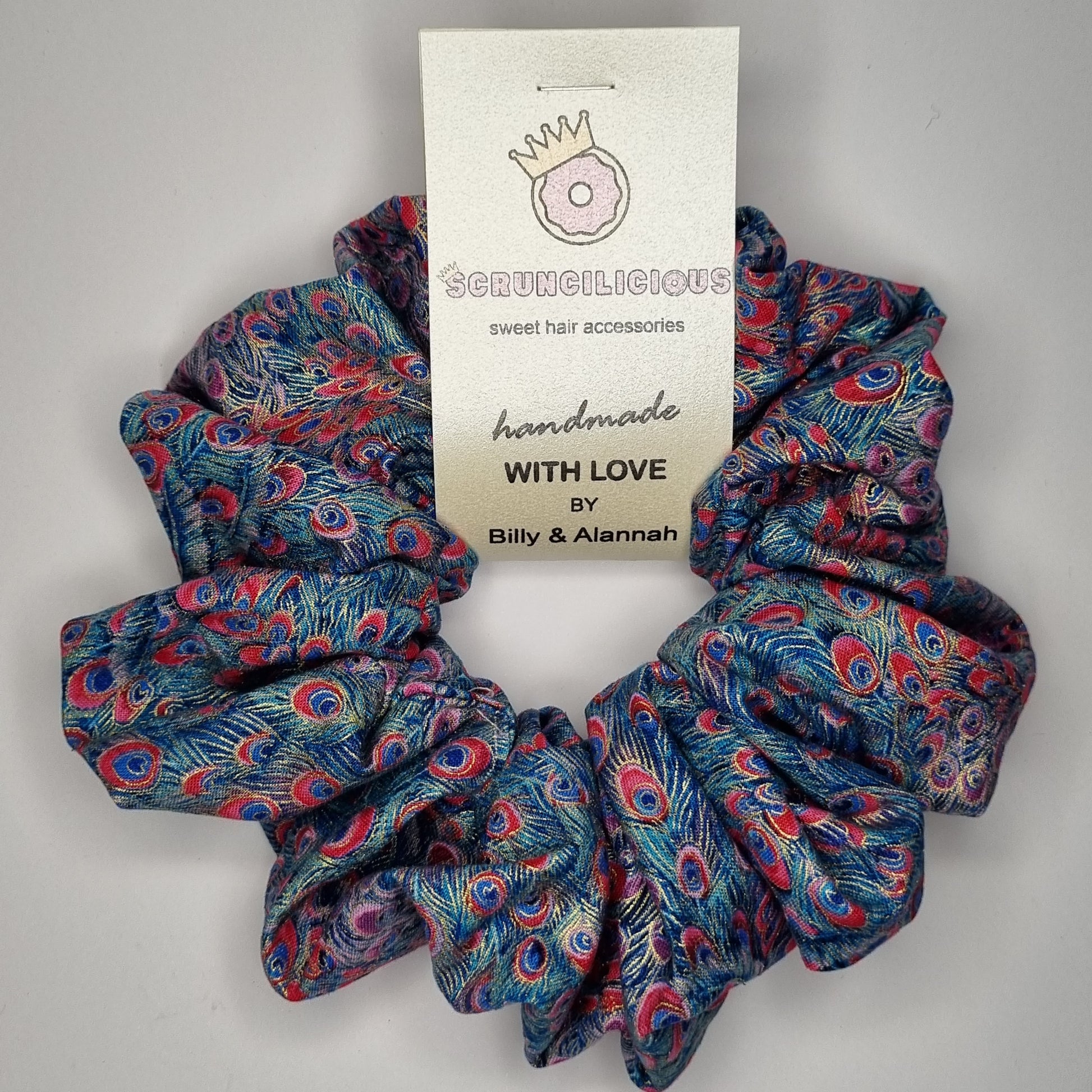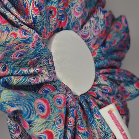 Look regal in this scrunchie, featuring peacock tail feathers.